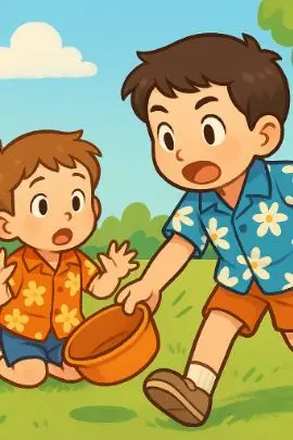 เมื่อถึงรถกระบะ เขายื่นขันให้คนบนรถที่กำลังมองเขาด้วยความประหลาดใจ พร้อมกับเสียงตะโกนของเขา “เอ้า! นี่ของคุณ!” เขาหยุดและยิ้มให้ ก่อนที่จะวิ่งกลับไปที่บ้าน แต่ยังไม่ทันที่เขาจะกลับถึงบ้าน เขาก็ถูกยายที่รออยู่ที่บ้านดุอย่างหนัก