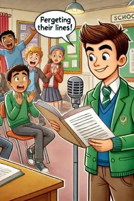 ในห้องเรียนที่เต็มไปด้วยความตื่นเต้น นักเรียนทุกคนกำลังรอคอยการแสดงที่สำคัญ ซึ่งนำโดยกลุ่มนักแสดงที่เคยฝึกซ้อมมาหลายสัปดาห์ เมื่อถึงเวลาที่ต้องขึ้นแสดง ทุกคนต่างรู้สึกกังวล แต่สำหรับเขาแล้ว การแสดงไม่ใช่เรื่องใหม่ เขาเคยทำหน้าที่พิธีกรให้กับเพื่อน ๆ ในงานใหญ่ที่มีผู้ชมมากกว่าพันคนแล้ว
